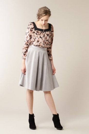 繊細な描写のフラワープリントに、グラデーションカラーをのせたプリントブラウス!花の中心から外側に向かってグラデーションがかかって、全体的に同色系にすることにより着やすいアイテムに仕上げました。アクセントにクルミボタンを並べ、スクエアネックの切り替えから、ギャザーを入れて女性らしいボリュームを演出。スカートINした着こなしもできます。