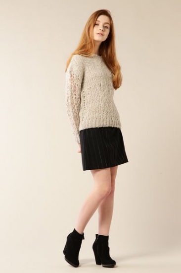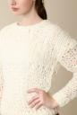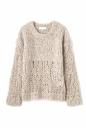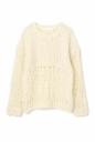 インポートの糸を手編みで編んだ贅沢なローゲージニットです。途中でゲージを切り替えたところを、デザインポイントにしています。少しルーズなシルエットが柔らかく女性らしさを主張した印象に。キレイめなパンツやスカート合わせたスタイリングがお勧めです。