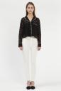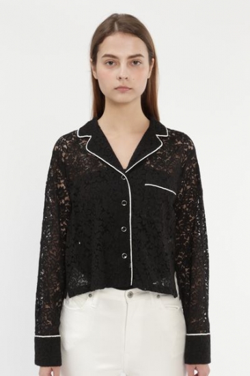 トレンドのパジャマブラウスをレースで仕立てた1枚。襟元や袖先など、細部のフチをパイピングでメリハリを加えています。インナー合わせて1枚で着てもサマになり、ボディにフィットしたニットをINして、襟を大げさに抜いた着こなしもお勧めです。
