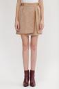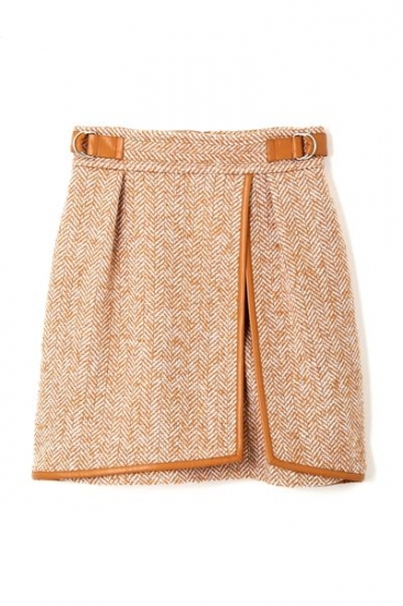 細かいヘリンボーン柄の生地で仕立てた台形スカート。大人が穿きやすいレングスとスリットディティール、フチを囲むパイピングをポイントでアクセントが効いているデザイン。ニットやシャツを合わせ、レトロ感ありながらも現代的なスタイリングをお勧めします。