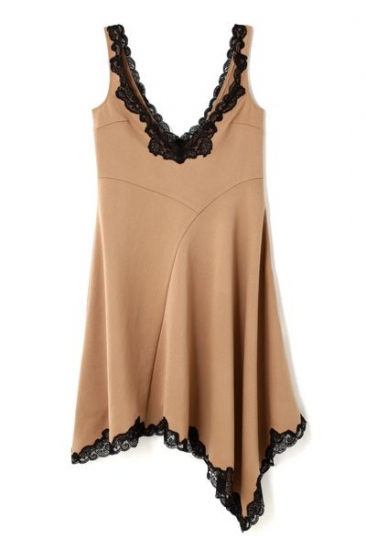 トレンドのランジェリーテイストで個性を出す、アシンメトリーワンピース!前後で深く開いた襟元で、センシュアリティーな印象と、優美なアシンメトリーに、JILLらしいレースをドッキングしたデザイン。ボディに沿った女性らしいシルエットは、ヘムラインがムード出しになります。インナーにリブトップスとレイヤードした着こなしもお勧めです。