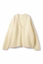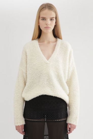 ウールのファー糸で仕立てたVネックニット。トレンド感のあるVネックでシャープさと、ゆったりめのシルエットが女性らしいデザイン。ボリュームに託した起毛感がラフなバランスで、デニムやスカートと合わせたスタイリングを楽しめます。