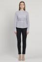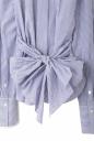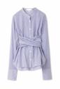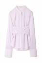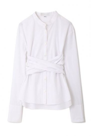 サイドのリボンを後ろから前に回し、糸ループを通し後ろで一つ結び出来るスタンドカラーシャツ。リボンにはタックとダーツ処理がしてあり、ビスチェのように引き締め、後ろで大きなリボン結びが出来ます。裾はアウトにしてパンツを合わせ、清楚感あふれるホワイトやストライプでスタイリングも一新します。