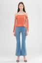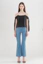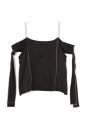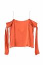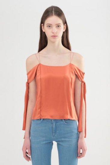 シルクサテンをサンドウォッシュして重さとニュアンスを出したブラウス。女性らしい肌見せや目を引くカラーとシルクの贅沢さを合わせています。大胆な袖先リボンや配色メローや後ろのヒモの交差も凝ったデザインポイントです。デニムと合わせたコーディネートがお勧めです。