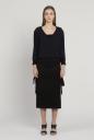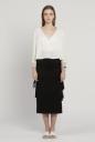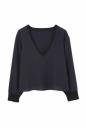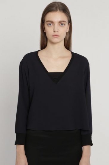 配色リブがデザインポイントの軽いバックサテンブラウス。深めのVネックがシャープな印象を与えてくれ、色により配色が違いますが、どちらも大人っぽいメリハリがあります。袖口リブにはタック編みが施され、大きく襟を抜いて肩見せした着こなしが女性らしく、今季らしい印象です。
