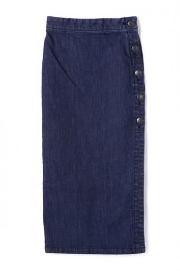 ストレッチの効いたキレイめデニムスカート。タイニィなシルエットに、長めの着丈が大人っぽく、サイドの釦を外してスリット調整して穿けます。加工が少ないキレイめの仕上げなので、カジュアルはもちろん、フェミニティーさもアプローチ出来る1枚です。