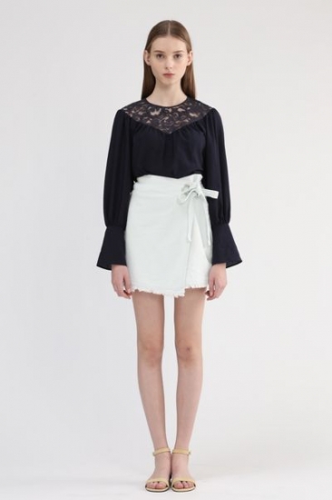 ややライトオンスの薄手に仕上げたラップスカート。ビックハトメや裾のフリンジもインパクトを作るトレンド感のある1枚。ボリュームスリーブシャツやニットやブラウスをINして、ウエスト結んだリボンで女らしく引き締めたコーディネートを楽しめます。
