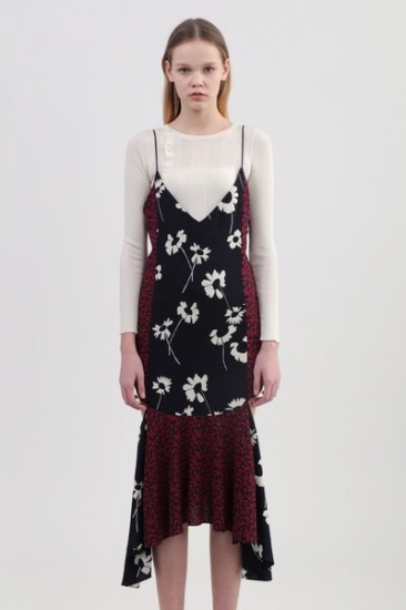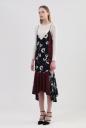 ヴィンテージ加工で風合いを出したジョーゼットに、大胆な配色の花柄を組み合わせたキャミワンピース。前後に大きく開いたカットや華奢な肩ヒモ、サイドから覗く肌がセクシーさと、歩くたびに揺れる差丈のあるヘムラインが個性的なデザイン。シンプルトップスとレイヤードしたスタイリングがお勧めです。※裏地付き