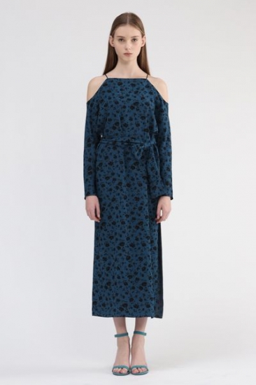 リラックス感のある袖付き花柄ワンピース。ヴィンテージ加工で風合いを出したジョーゼットで仕立てています。オープンショルダーに共地ベルトでウエストマーク、サイドの深いスリットがちらりと脚を覗かせたセクシーなデザイン。お手持ちのベルトを巻いて雰囲気違いも楽しめます。ロング丈なので、深いスリットが映える大人の女性にぴったりな1枚です。