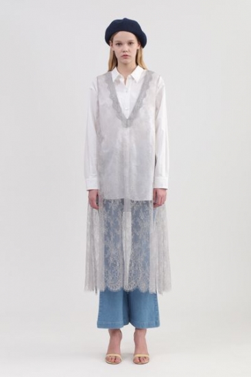 重ね着スタイルにJILLらしいフェミニティーな要素を足すレースワンピース。ランジェリー感のあるレースをベースに、シャープな両Vネックの後ろはレースアップを施し、裾はレーススカラップで軽やかな仕上がり。緩やかなフレアシルエットで身体をカバーしてシアーな透けを楽しめます。※膝丈ベア付き