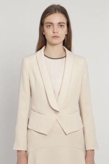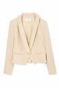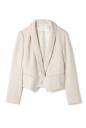 ヘチマカラーのショート丈のタキシード風のデザインジャケット。ストレッチ性があり、美しく出るツイルが上品な印象の素材で仕立てました。ウエスト位置を高く見せてくれそうなスッキリしています。単品もちろん、同シリーズと、セットアップ対応もしています。