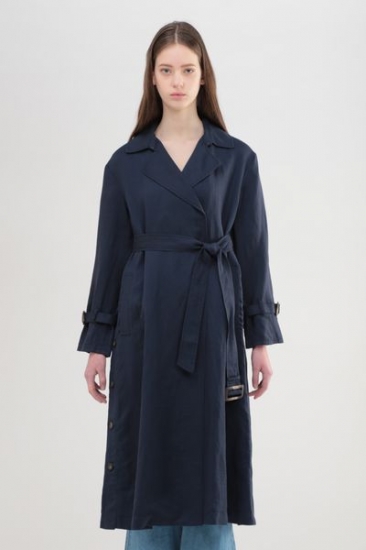 麻ビスコートの洗いをかけたトレンチコート。かっちり感のあるトレンチとは違い、ナチュラルでリラックス感のある風合いや大きなサイズ感です。袖先のバックルはピンナシなので、ご自身で調節させて、袖の丈を好きなところでとめられます。女性が羽織るロング丈で大人っぽいニュアンスをだせ、デニムスタイルから、サイドの釦を外し、プリントドレスを覗かせたコーディネートまで楽しめます。