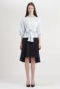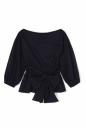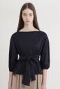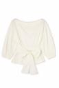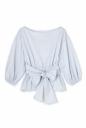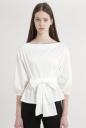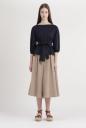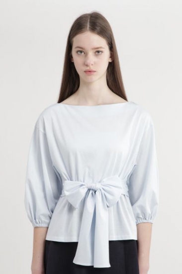 キレイめコットン生地で仕立てたブラウス見えのするカットソー。大きく開いた襟元でスッキリするので、トレンドのボリュームスリーブが映えます。共地リボンを大きく前で結んでポイントにしたり、後ろに結んでゴムのデザインディティールを見せたりアレンジ出来ます。パンツがお勧めですが、ミディ丈のスカートで甘さを足したスタイリングも楽しめます。