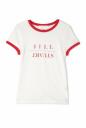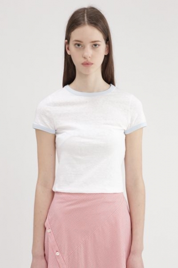 シンプルロゴの配置で個性を出したリンガーTシャツ。ボディに沿ったシルエットに柔らかいコットンで仕立て、ヴィンテージな雰囲気も女らしい1枚。襟元や袖先の配色でエッジを効かせ、デニムでカジュアルに、あえてフェミニンなスカートに合わせたコーディネートまで着こなせます。