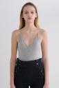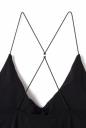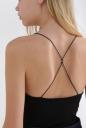インティメイトシリーズです。パット付きのキャミソールはボディにフィットしたサイズ感。シャープに開いた胸元や華奢な肩ヒモは後ろでクロスして女性らしさが増すデザイン。ボトムINしても裾がでてこないのでとても楽に着こなせます。