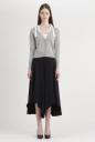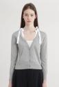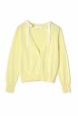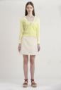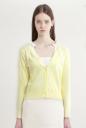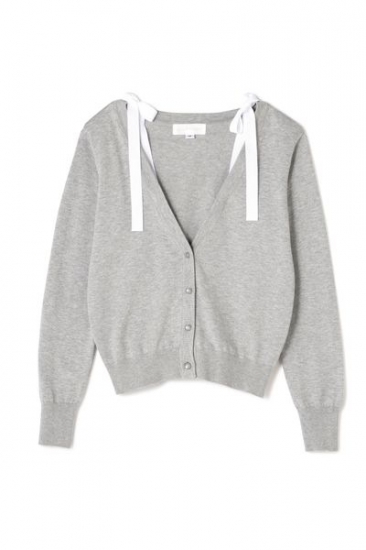 肩についた配色グログランリボンがポイントのカーディガン。コットン×シルク2%でサラリと着やすく触りもよい素材で仕立てています。リボンを結んで襟を抜いてオフショルのような着こなしがお勧めですが、リボンをほどいて内側にしまいベーシックデザインとしても着こなせます。