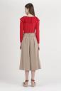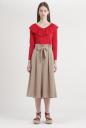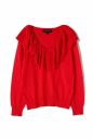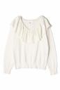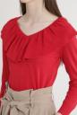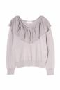 襟ぐりに女性らしいニュアンスを引き出すラッフルを施したニット。V開きのラインが首元をキレイに見せてくれます。ラッフルは畦編みで立体的に、身頃はスッキリ編み込み、スカートと相性良くコンパクトめに仕上げた1枚です。