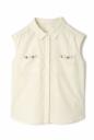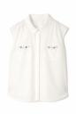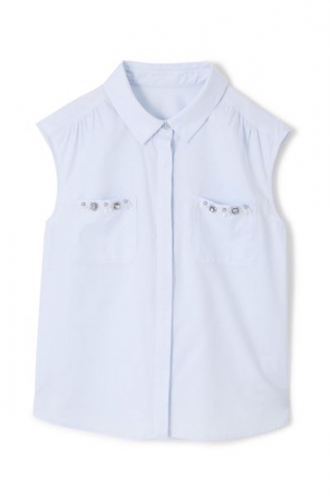 シンプルなレギュラーシャツの胸ポケットにキラキラ装飾をドッキングして好ポイントに。きちんと感があるのでオフィスも馴染み、ボトムINしたコーディネートもキレイにキマります。ノースリーブなので、カーディガンを羽織れば今からロングランで活躍してくれます。