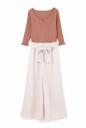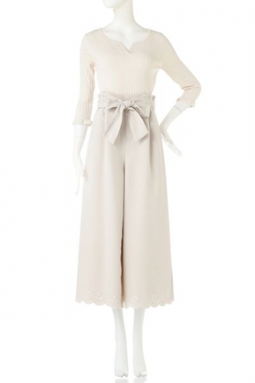 ニット×ワイドパンツのセットアップです。上下のニュアンスカラーが洒落っ気アップしてくれる組み合わせです。リブニットは、ボディに沿ったシルエットに、大きく開いた胸元や袖先フリルで可愛いポイントを。ワイドパンツは、ウエストフリルに共地リボン付きでINした時にメリハリがあり、裾のスカラップは生地と同色刺繍を施して甘すぎずに穿けます。それぞれ単品からセットまで使える便利なアイテムです。※上下セットアップ