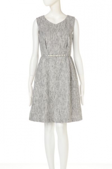 春ツィードで品格アップするフレアワンピース!ノースリーブで適度な肌見せができ、カーディガンも羽織りやすいです。ウエスト切り替えた中央に、ミニパールを陳列させてメリハリとリッチなワンポイントを作ります。日常からちょっとしたイベントまで対応できる1枚です。※裏地付き