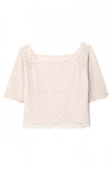 大きく開いた襟元でデコルテをスッキリ見せるオフショルレーストップス!ショルダーはうっすら肌を覗かせるシアーな生地に、くるんとなった袖先や裾のレーススカラップの細かなディティールで可愛さをプラス。身体に沿ったシルエットでスッキリ着こなせるのでトレンドのワイドボトムとも相性良く着こなせます。さりげなく背面にジルバイプレートをONしています。