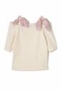 ショルダーにスカーフがドッキングしたオフショルトップス!ソフトな風合いで着心地良く、程よい肌見せバランスにスカーフが旬なアクセント。ワイドやフレアスカートでレディなコーディネートが完成します。