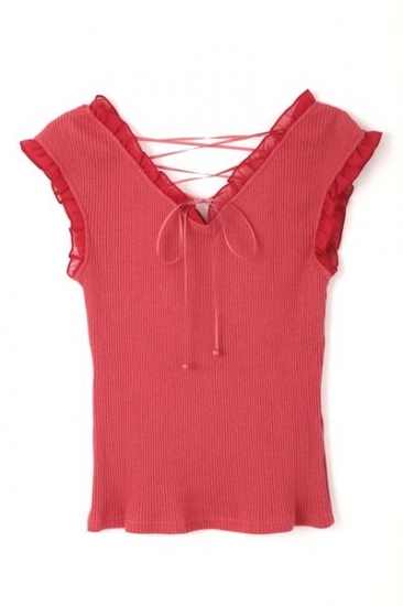 ショルダーフリル×レースアップで可愛さ満点なリブトップス!同色系の異素材をショルダーにドッキングして、エアリーな雰囲気を覗かせて。後ろはレースアップでバックシャンなところもこだわりポイントです。ボディに沿ったシルエットなので、ワイドボトムと相性抜群です。