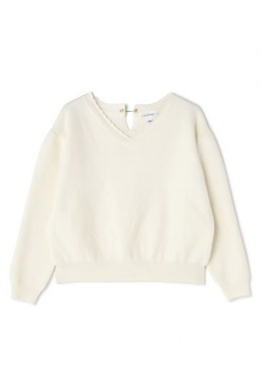 大きく開いた襟元でヌケ感のあるVネックニット!Vネックに沿って編地を変えたり、後ろは付属のパールピンを留めたりと、細かなディティールが愛らしい雰囲気です。ドロップショルダーにゆったり着こなせるサイズ感が着心地良く、カジュアルやフェミニンまでコーディネートが組めます。