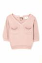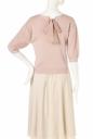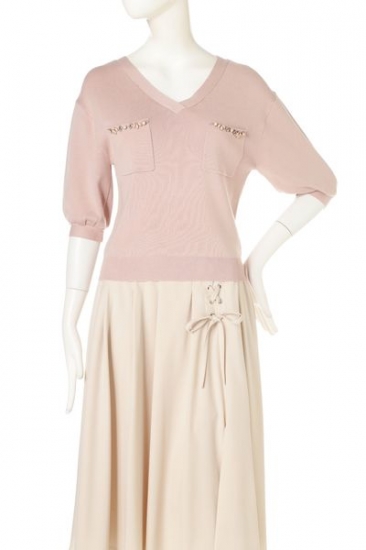 スキッパー型のヌケ感あるニット!ポケ部分にストーンの装飾や、バックリボンを加えて、後ろ姿も可愛いをアピールするデザイン。ブームのスキッパーブラウスをニットにして、半端袖丈も手伝い、冬から春に向けて着られる1枚です。