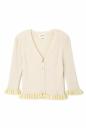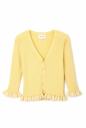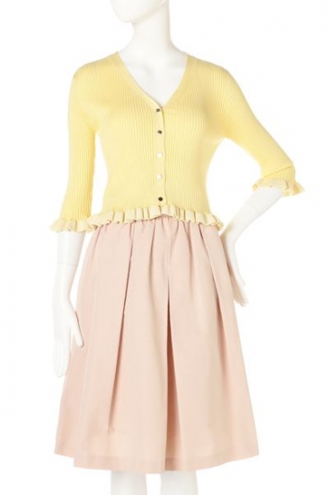 身体にフィットする伸縮性のある生地で仕立てたカーディガン!袖先や裾の配色ちびフリルが最大のデザインポイント。いつものコーディネートに投入でぐっと今ドキ感をアピールしてくれる可愛い1枚です。