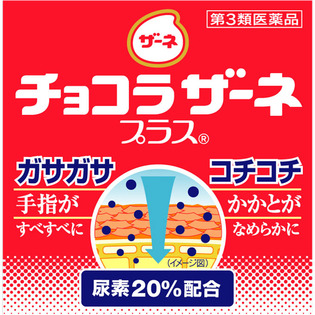 チョコラザーネプラスは、尿素(20%)、ビタミンE、グリチルリチン酸二カリウムの働きにより皮膚の水分を保持しながら皮膚をやわらかくするとともに、適度の油分を補なって荒れた皮膚の症状を改善する医薬品のクリームです。ガサガサした手指とコチコチのかかと、ザラザラする肌などに効果的です。皮膚の水分を保つ成分と油分をバランス良く配合しているため、肌によくなじみ、さらっとしているのにしっとり感が持続します。