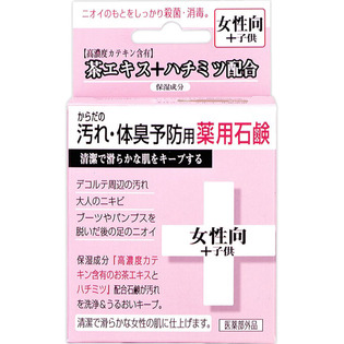 高濃度カテキン含有のお茶エキスとハチミツ(保湿成分)配合石鹸が汚れを洗浄、うるおいをキープし、清潔で滑らかな女性の肌に仕上げます。