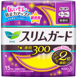 高吸収ポリマーがぎっしり入っているから、こんなにスリムでふつうの夜用ナプキン※1の2倍も吸収!多い夜も安心してぐっすり